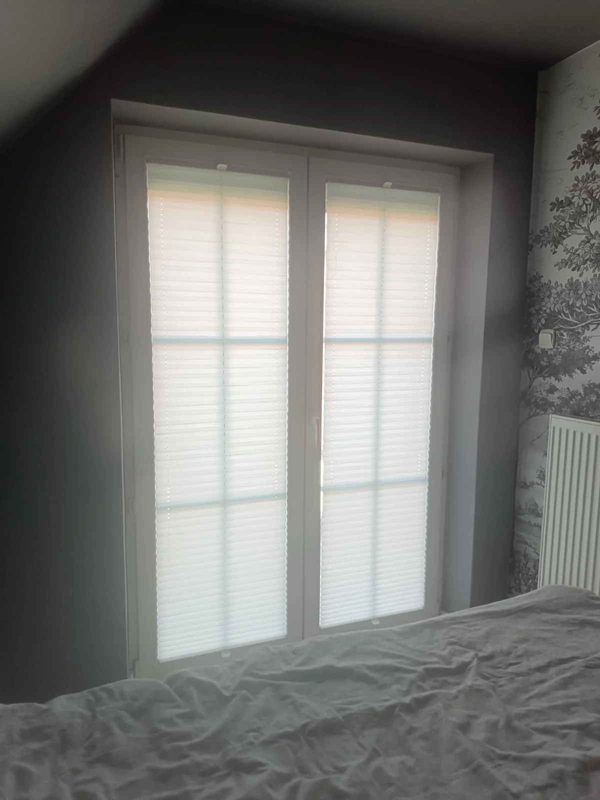 Plisy okienne w kolorze białym zamontowane na drzwiach balkonowych w sypialni. Lekka tkanina zapewnia prywatność i subtelnie rozprasza światło, tworząc przytulną atmosferę.